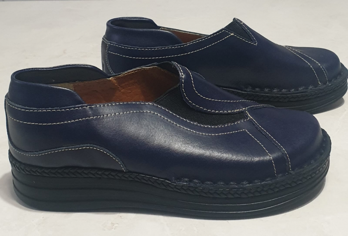 Pantofi dama din piele naturala cu talpa ortopedica,cusute manual,care v-a prelua forma piciorului ,avand un talonet moale din burete,sunt foarte comozi si practici,inaltimea talpii fiind de 3.5cm in spate si 2.5 cm in fata!